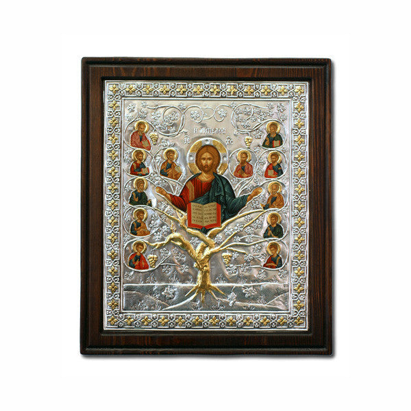 Silkscreen icon with silver coating, locally gilded, made of aged natural wood; the picture is accompanied by a wooden stand