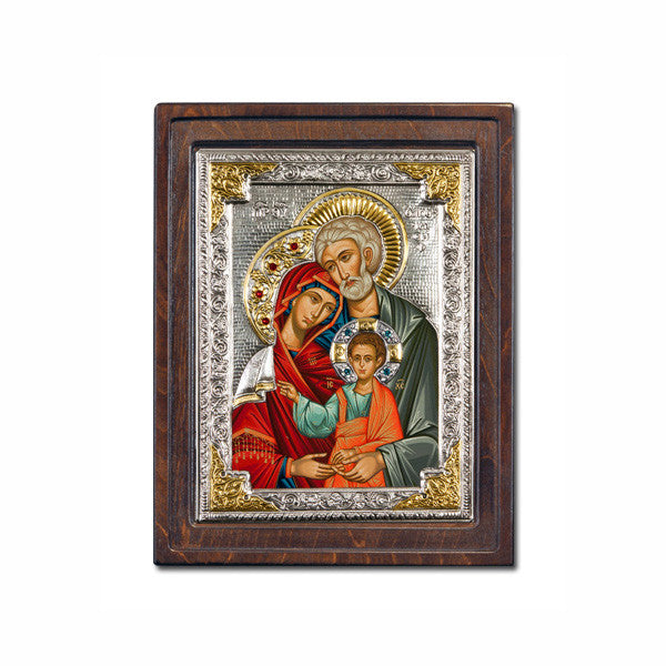 Silkscreen icon with silver coating, locally gilded, made of aged natural wood; the picture is accompanied by a wooden stand